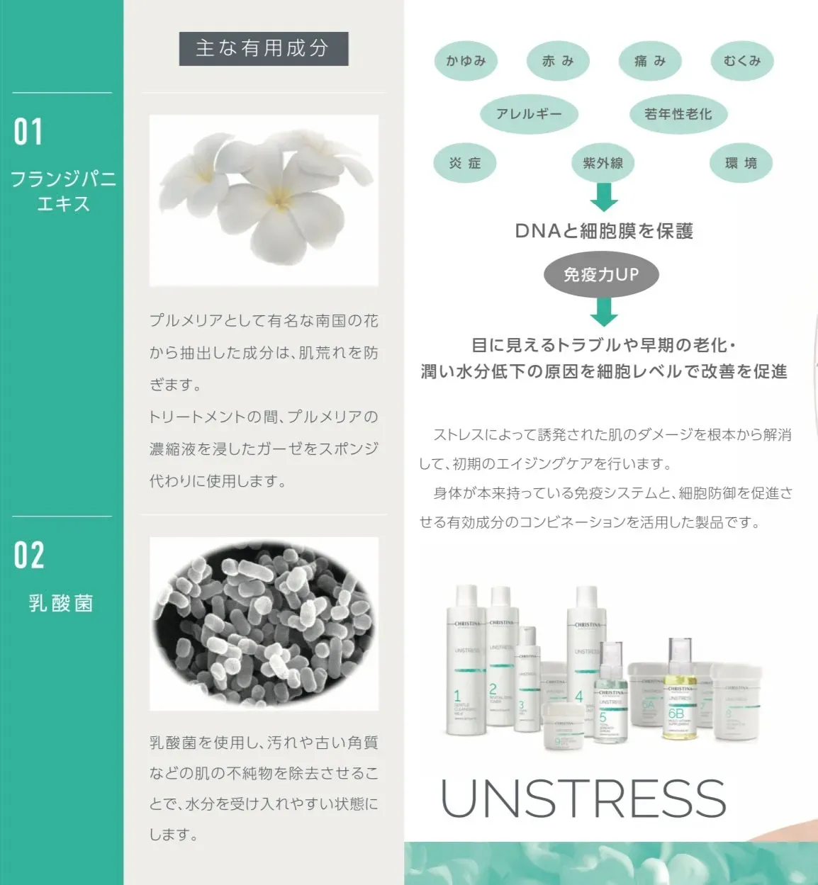 プルメリアの濃縮液を浸したガーゼで拭き取りを行います。抗菌性や抗炎症に非常に優れており、ストレスを受けた肌を鎮静しながら、様々な刺激から肌を保護します。